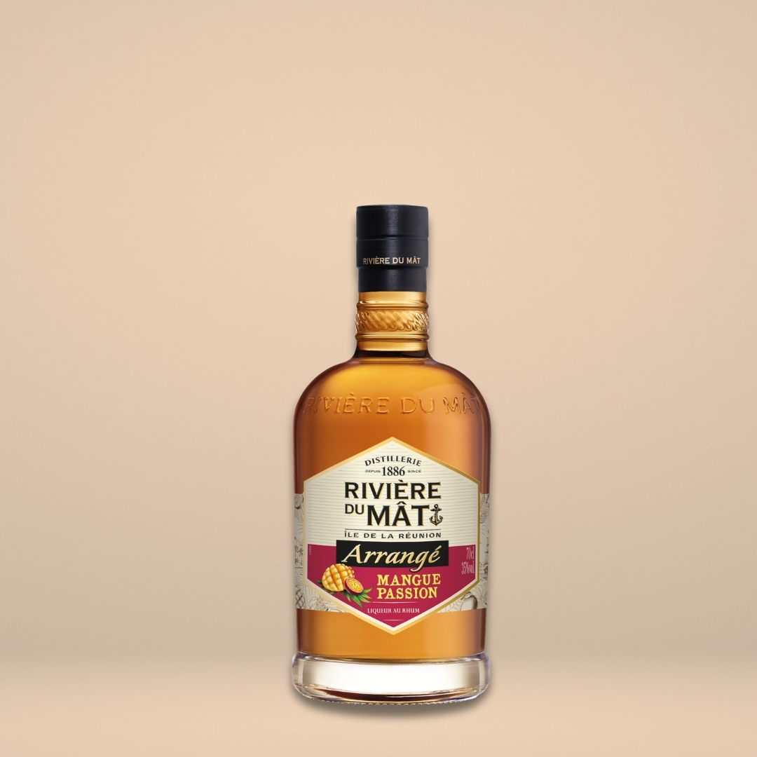 Rhum dal colore ambrato. Realizzato con rum Rivière du Mât, con note naturali di mango, frutto della passione e spezie selezionate. Fruttato, fresco e intenso.