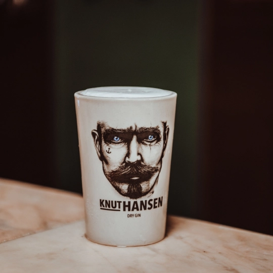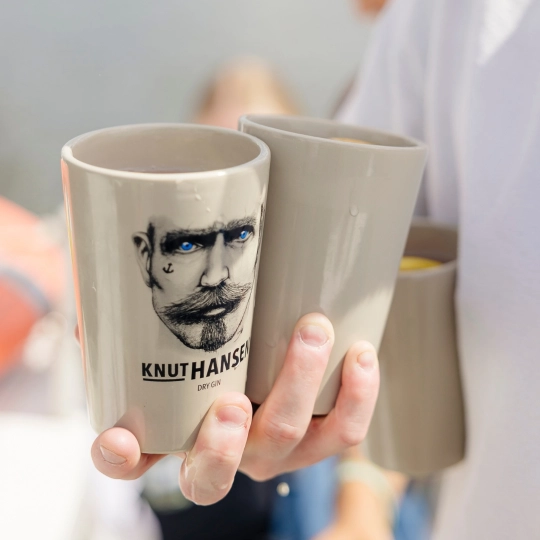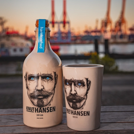 Box in carta contenente Knut Hansen Dry 50 cl + 2 bicchieri in ceramica marchiati Knut Hansen.